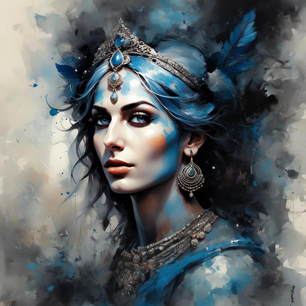 A striking portrait of a woman adorned in exquisite black attire, embellished with intricate gold details and blue gemstones. Her long, braided hair and regal crown evoke a sense of elegance and grandeur, set against a richly patterned backdrop that enhances the overall composition.