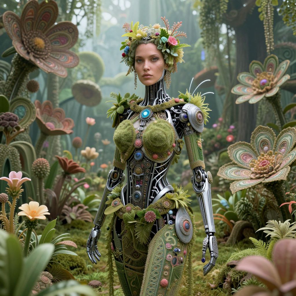 A futuristic woman robot intricately designed with a blend of metallic and botanical elements stands amidst a surreal forest of oversized, stylized flowers. The harmonious fusion of organic and mechanical textures creates an enchanting, nature-inspired sci-fi aesthetic.