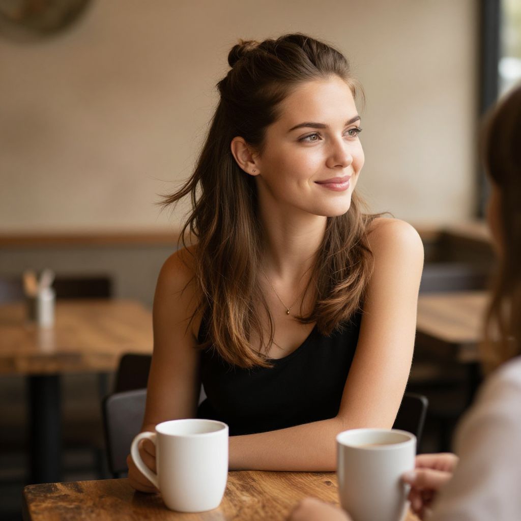 A young woman with long brown hair styled half-up sits at a wooden table in a cozy cafe, smiling softly while holding a white mug. The warm lighting and blurred background create an inviting atmosphere, capturing a candid moment of relaxed conversation.