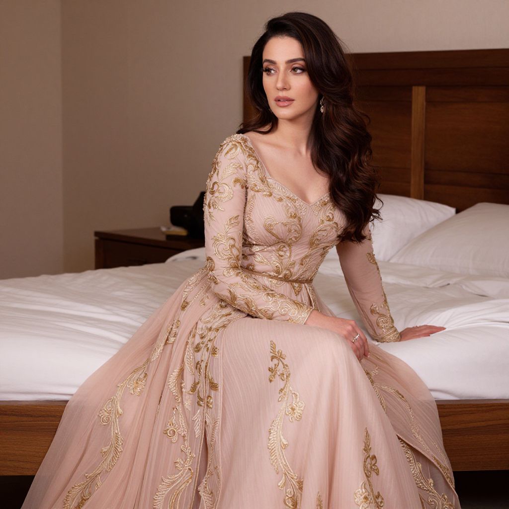 A woman is elegantly seated on the edge of a bed wearing a long, intricately embroidered blush pink gown with gold detailing. Her dark, wavy hair frames her face as she gazes thoughtfully to the side in a softly lit room with neutral decor.