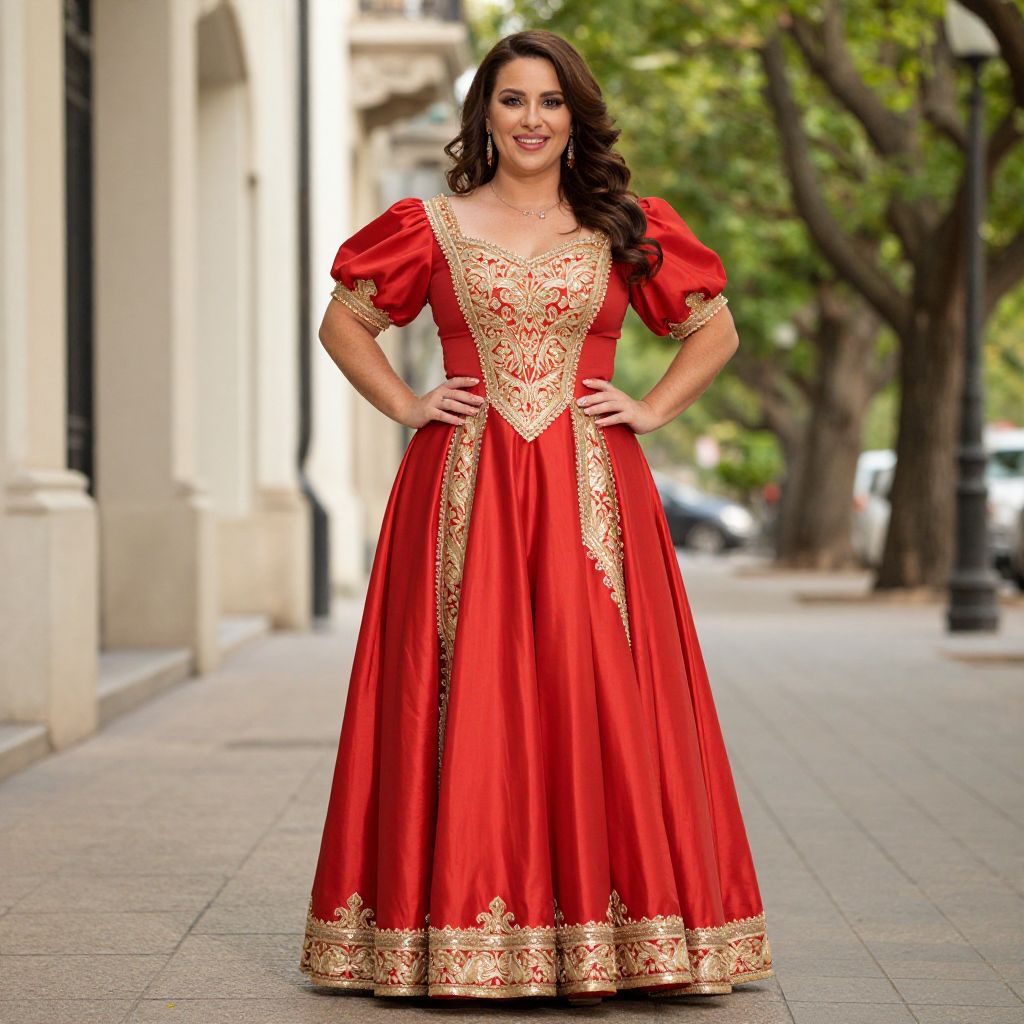 A confident woman stands outdoors wearing an elegant red gown adorned with intricate gold embroidery on the bodice, sleeves, and hem. The full-length dress features puffed sleeves and a fitted waist, blending traditional and formal style elements in a vibrant urban setting.