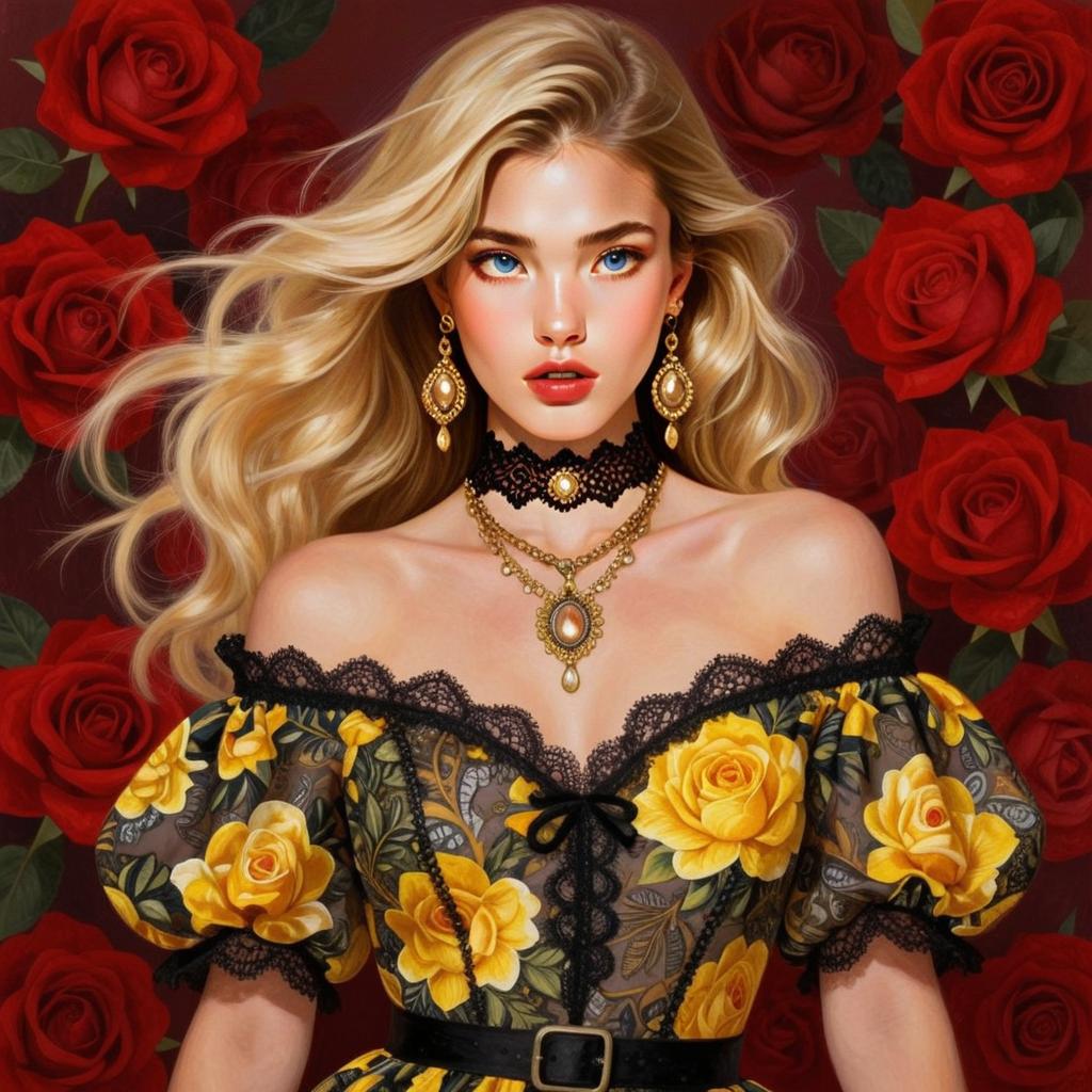 This digital portrait features a stunning woman with flowing blonde hair and striking blue eyes, wearing an off-shoulder dress adorned with vibrant yellow roses and intricate black lace. Set against a rich background of deep red roses, the artwork blends classic floral motifs with modern fantasy illustration elements, enhanced by detailed jewelry and a soft, luminous color palette.
