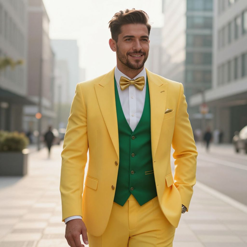 A stylish man confidently walks down a city street wearing a vibrant yellow suit paired with a green waistcoat and a matching yellow bow tie. The modern urban backdrop complements his sharp and contemporary fashion sense, highlighting his cheerful and poised demeanor.