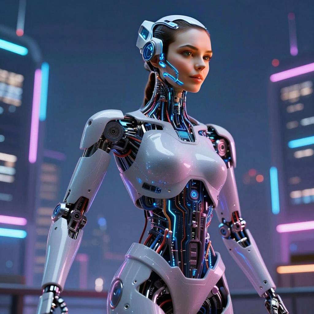 Futuristic Cybernetic Woman Robot in Neon Cityscape