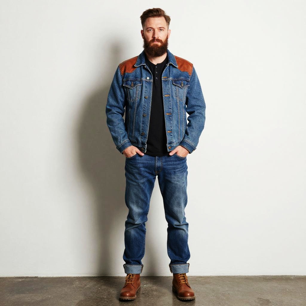A bearded man stands confidently against a plain white background, wearing a denim jacket with brown leather shoulder patches, paired with rolled-up jeans and brown leather boots. His casual yet rugged style reflects a contemporary take on classic Americana fashion.