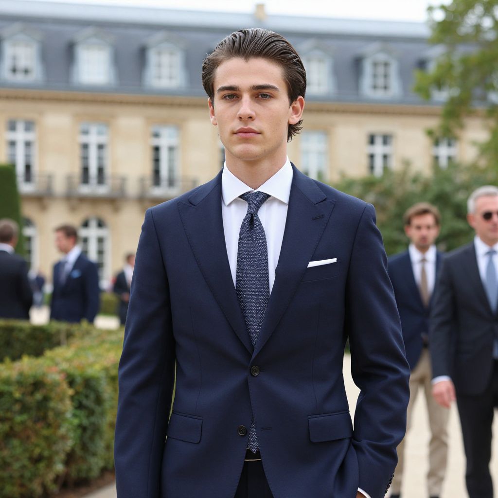 A young man dressed in a sharp navy blue suit with a white shirt and patterned tie stands confidently outdoors, with a historic building softly blurred in the background. The image captures a formal, elegant style suitable for business or professional contexts, with other similarly dressed men visible behind him adding depth to the scene.