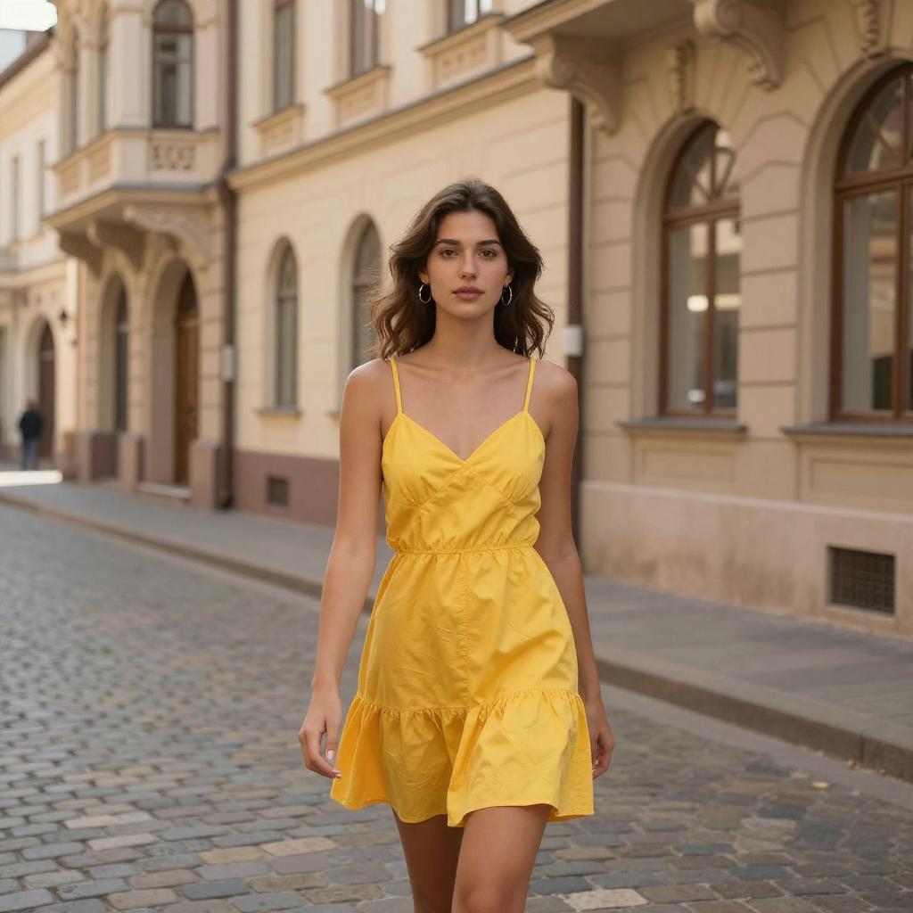 A young woman walks confidently down a cobblestone street in a European-style city setting, wearing a bright yellow summer dress with thin straps and a ruffled hem. The image captures a natural, candid moment perfect for fashion and lifestyle themes, highlighting effortless street style.
