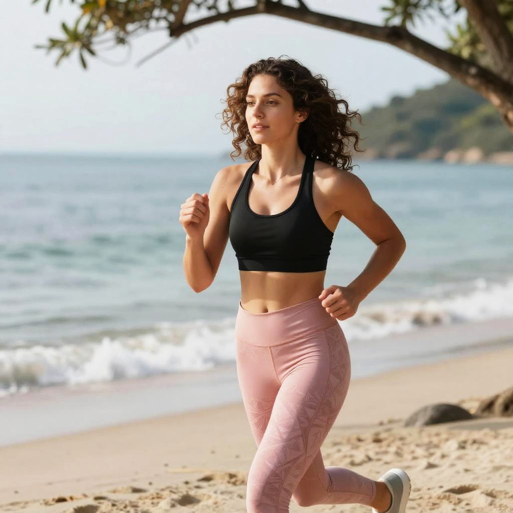 A young woman is jogging along a sandy beach, wearing a black sports bra and pink patterned leggings. The scene captures a healthy, active lifestyle with the ocean and distant greenery in the background under natural daylight.