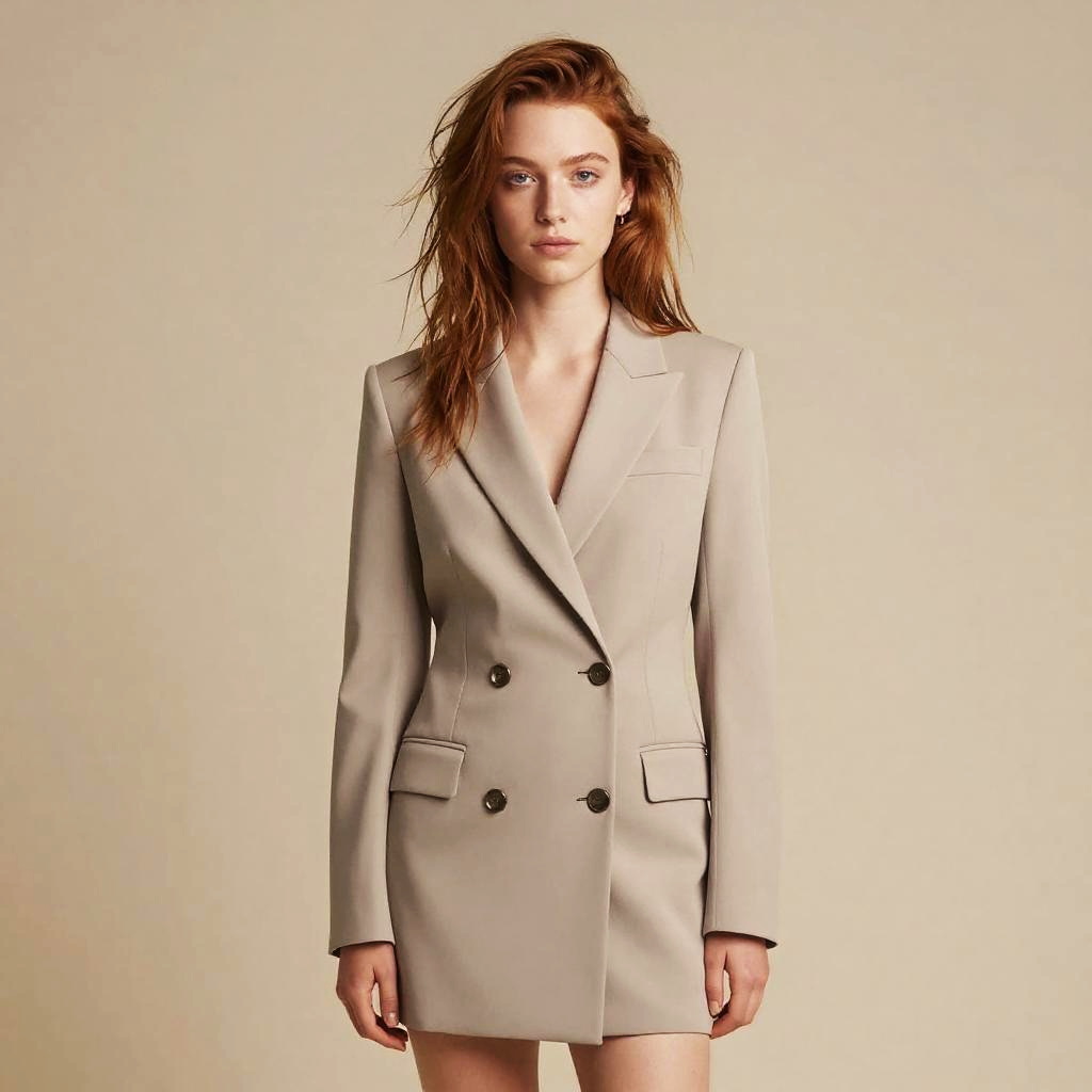 A young woman with red hair poses against a neutral beige background, wearing a tailored double-breasted beige blazer dress. The clean lines and minimalistic style reflect contemporary Gen Z fashion trends focusing on sharp tailoring and monochromatic tones.