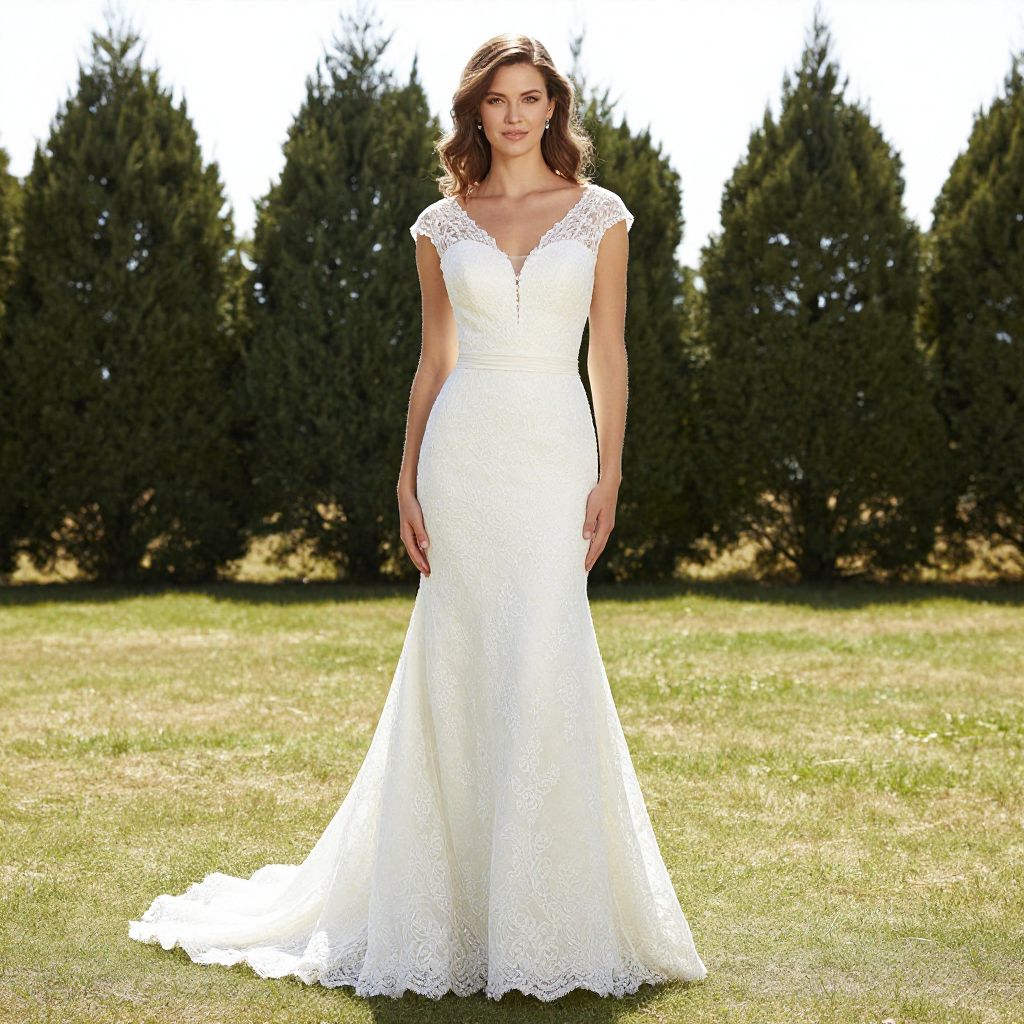 A woman stands gracefully outdoors wearing a fitted lace wedding gown that features a delicate V-neckline and cap sleeves. The dress extends into a subtle train, showcasing elegant floral lace patterns against a natural backdrop of trimmed evergreen trees.