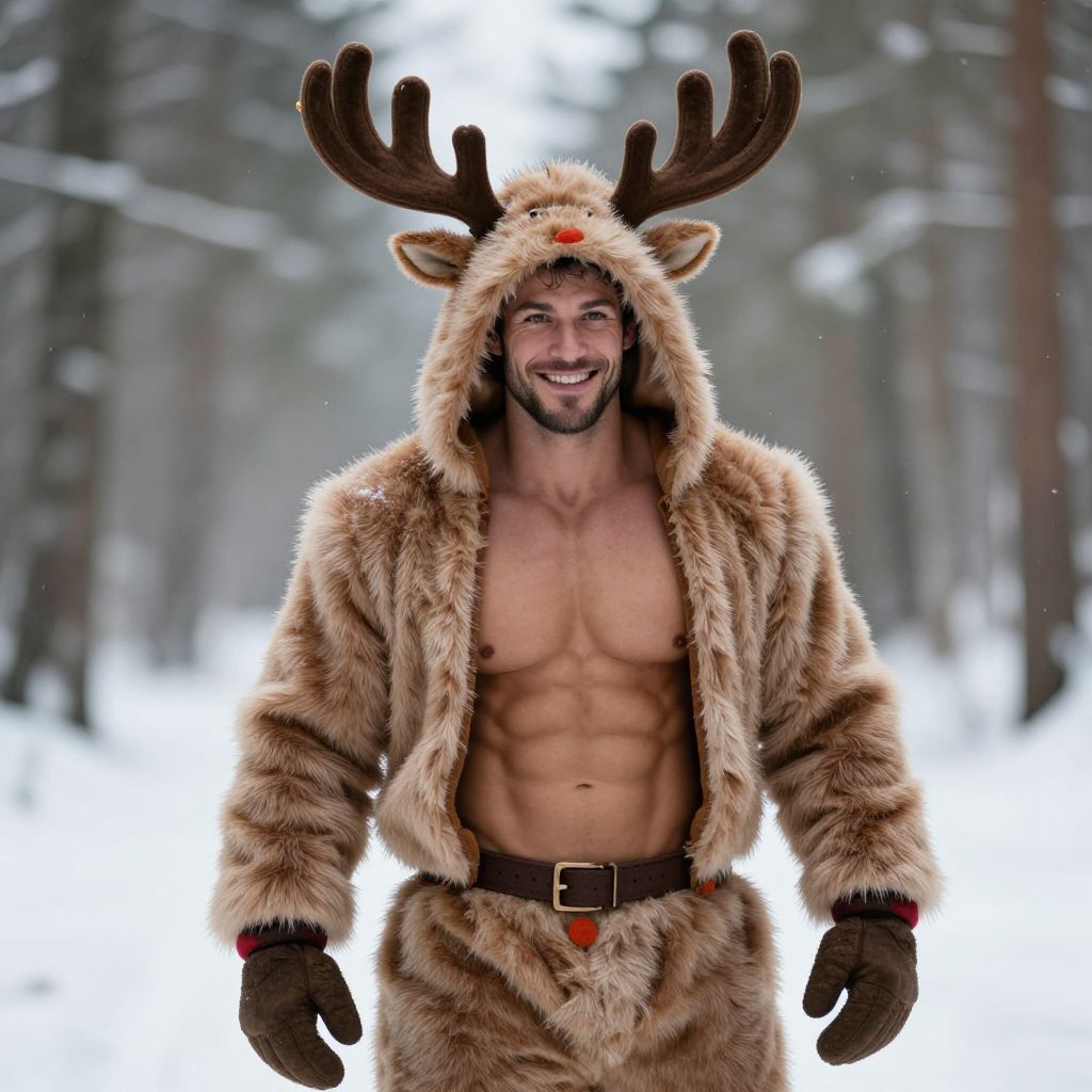 A shirtless man is dressed in a playful reindeer costume featuring faux fur, antlers, and a red nose on the hood as he stands smiling in a snowy forest. The cozy yet humorous outfit contrasts with his toned physique, creating a striking winter-themed image with a festive and fun vibe.