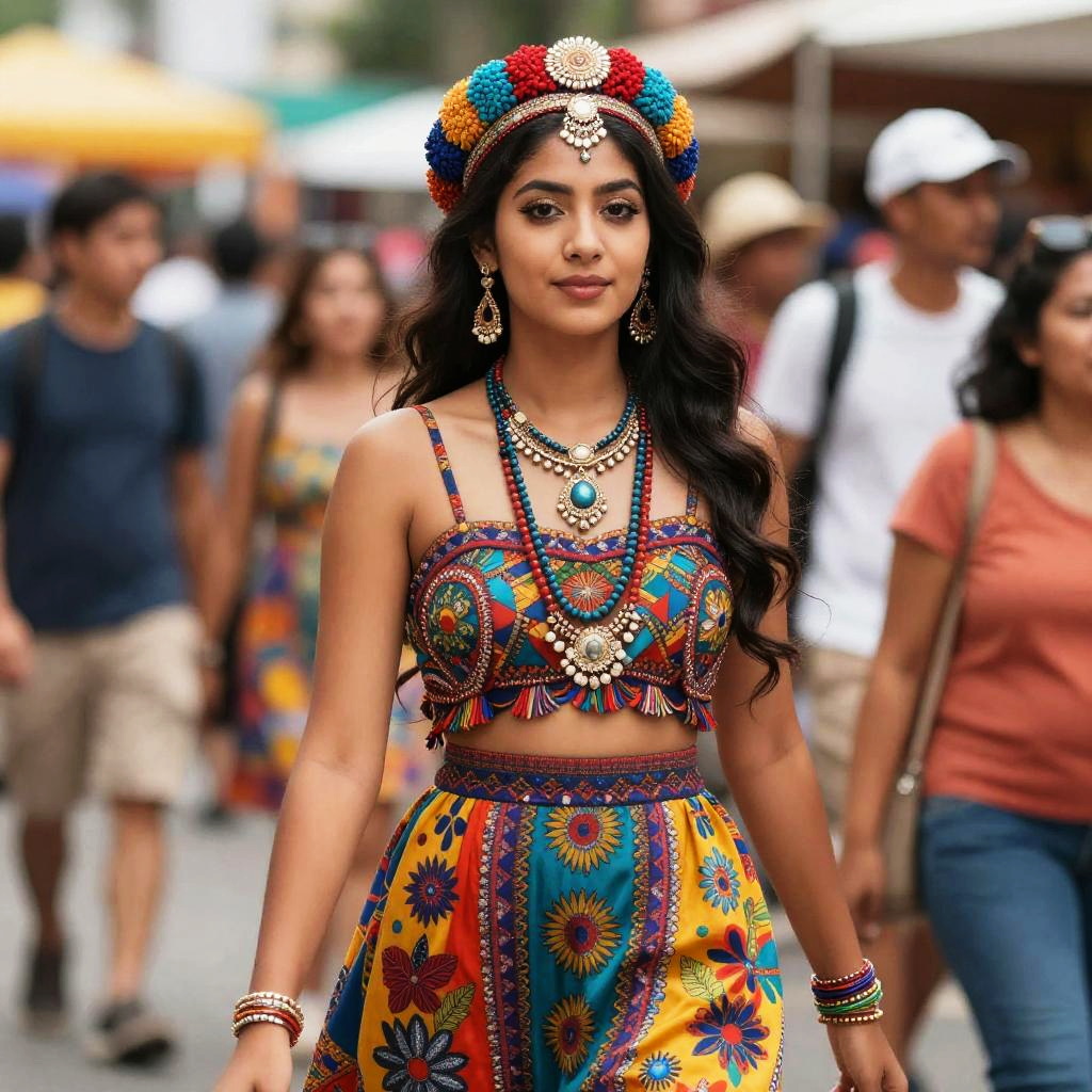 A woman dressed in vibrant festival clothes featuring a colorful floral-patterned crop top and matching skirt. She accessorizes with layered beaded necklaces, large ornate earrings, and a multicolored headpiece, embodying a lively and festive style. The street background with blurred people adds a dynamic, celebratory atmosphere.