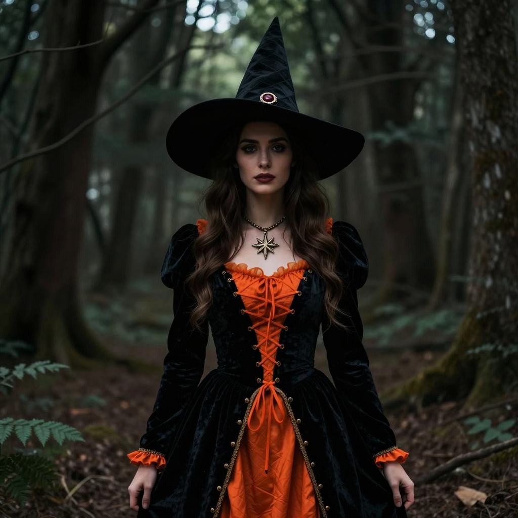 A young woman dressed as a traditional witch stands in a dim, mystical forest. She wears a black velvet dress with bright orange accents, complemented by a classic tall, pointed witch hat and a distinct star pendant necklace, creating a haunting yet elegant Halloween look.