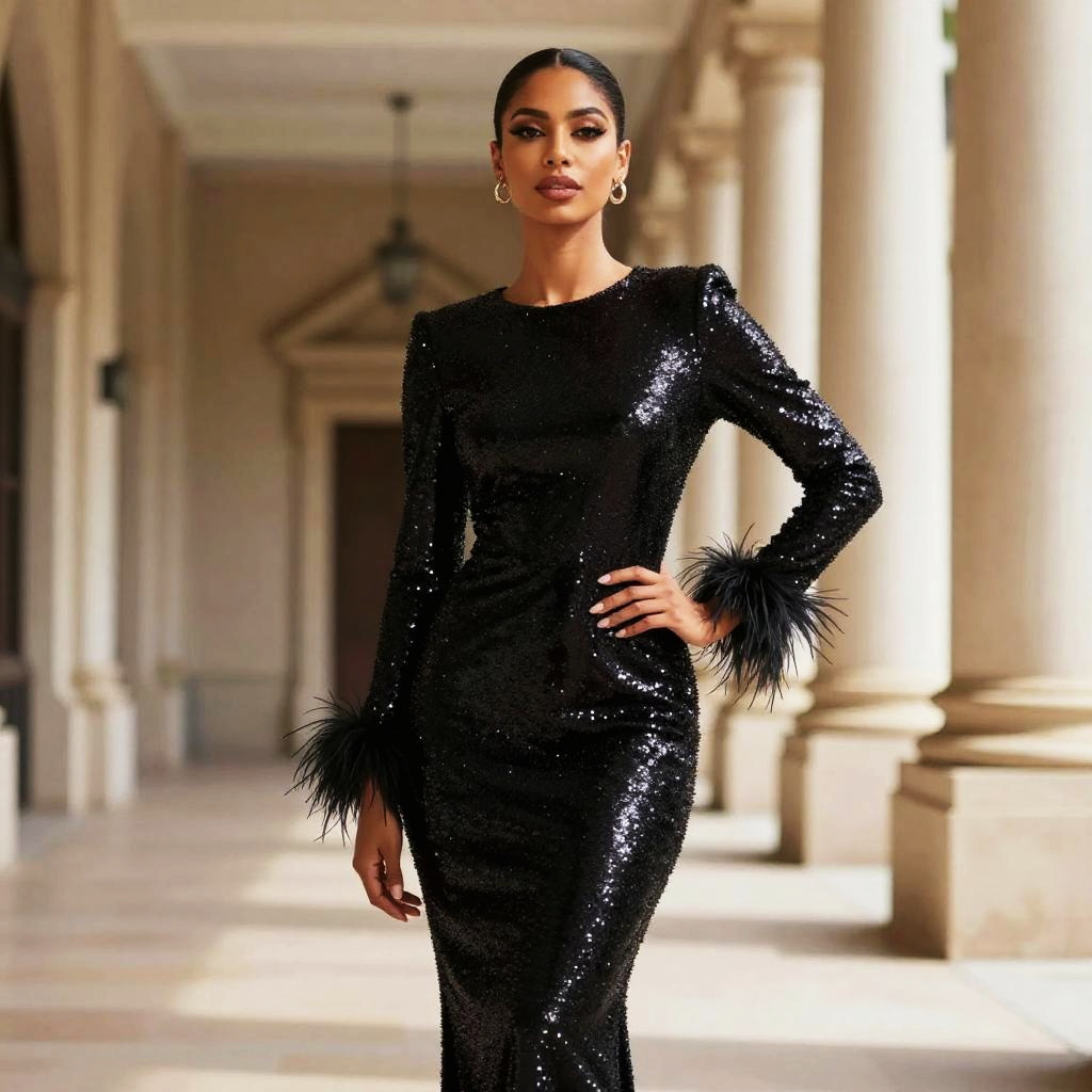 A confident woman poses elegantly in a shimmering black sequin dress with feathered cuffs, set against a classical architectural backdrop featuring tall columns. The long-sleeved dress highlights a modern, glamorous style perfect for evening or formal events.
