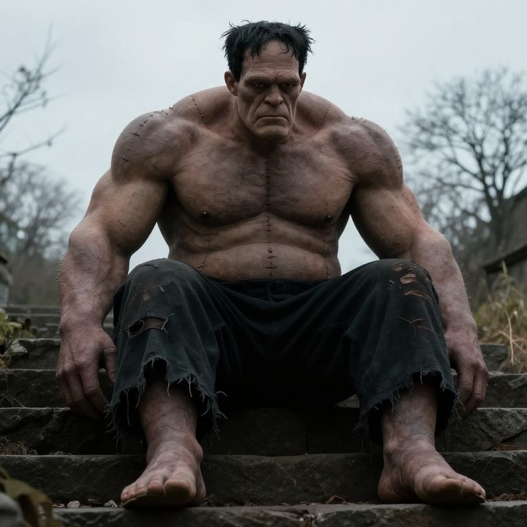 A muscular, monstrous man with stitched scars across his chest and arms sits barefoot on stone steps in an outdoor setting, exuding a grim and somber mood. Wearing tattered black pants, this figure resembles a modern interpretation of Frankenstein's monster in a realistic and cinematic style.