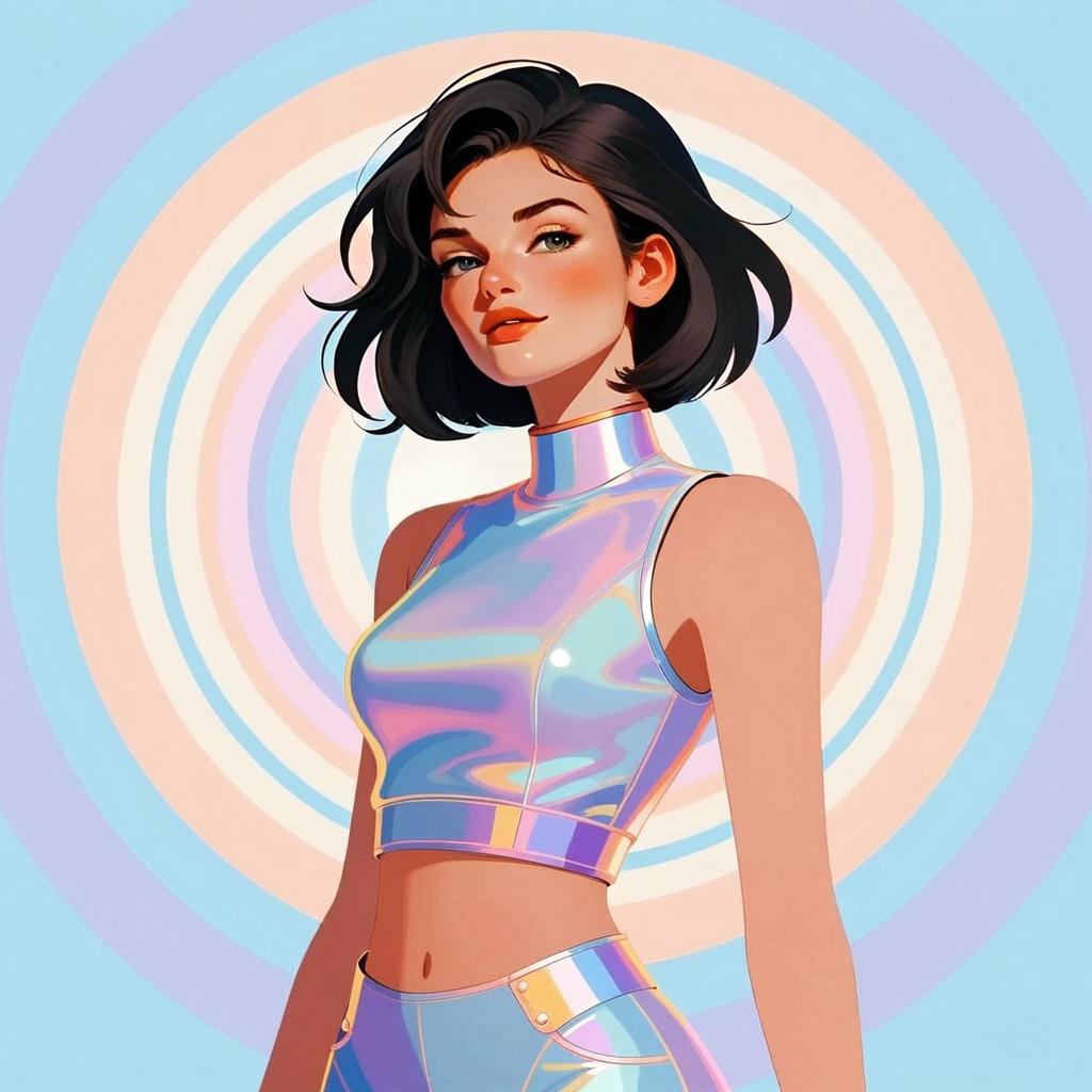 This vibrant digital illustration features a confident woman with short dark hair wearing a futuristic, holographic crop top and high-waisted pants. The background showcases concentric pastel circles that enhance the modern, stylish, and slightly retro-futuristic aesthetic of the artwork.