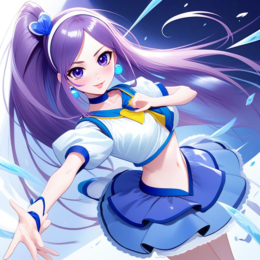 This vibrant anime-style illustration features a confident young woman with long purple hair tied in a high ponytail, dressed in a dynamic blue and white sailor-style outfit accented with yellow. She reaches forward with an inviting gesture amid swirling icy elements and sparkling light effects, capturing a lively and energetic mood.