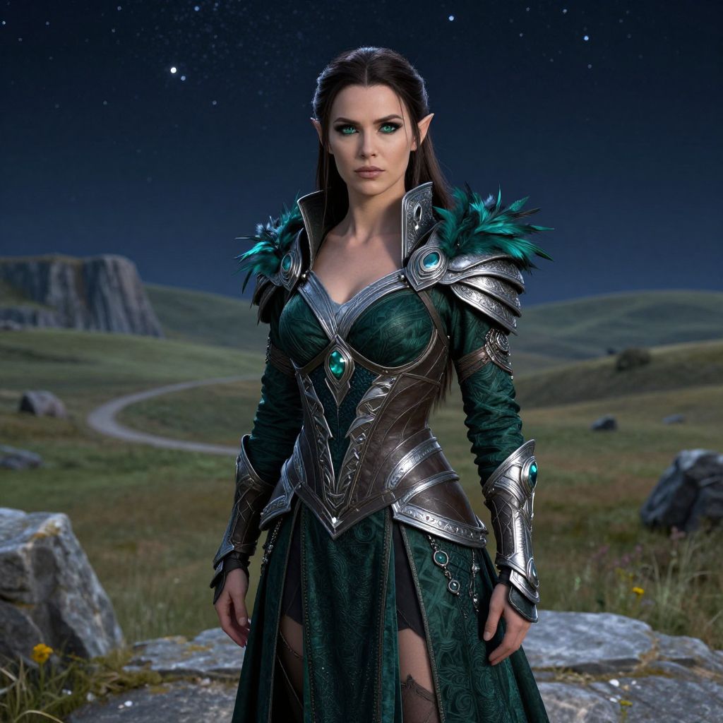 A fierce woman elf warrior stands confidently in a detailed fantasy armor adorned with metallic plates and teal feathers, set against a serene night landscape with rolling hills and a starry sky. Her piercing green eyes and pointed ears highlight her mythical nature, blending high fantasy and realistic portrait styles.