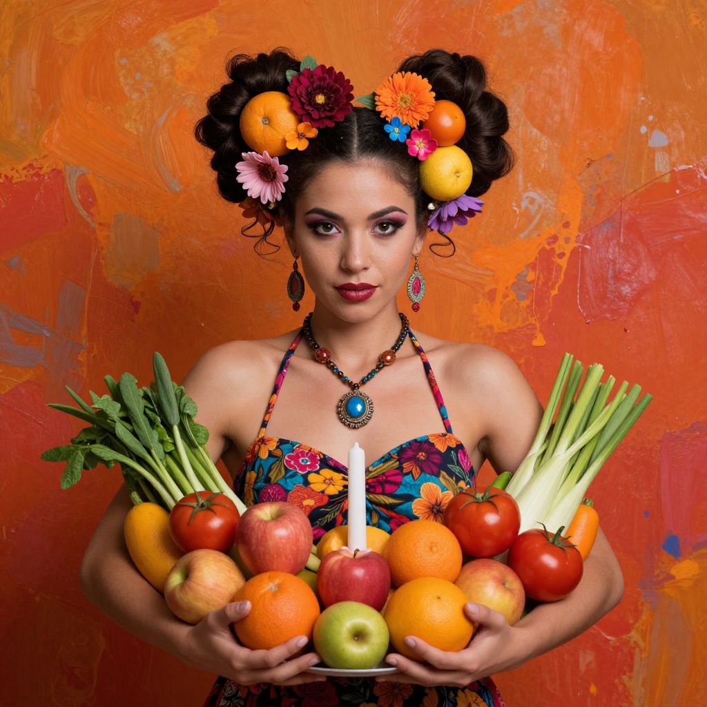 A woman with elaborately styled hair adorned with fresh flowers and citrus fruits poses against a vibrant orange background. She holds a tray overflowing with a colorful assortment of fresh fruits and vegetables, centered with a white candle, embodying a lively and artistic still life composition.
