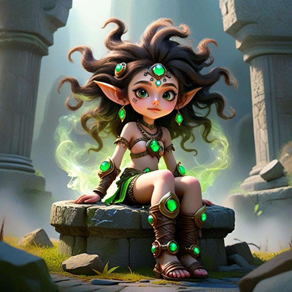 A young elf woman with large green eyes and flowing dark hair adorned with glowing green jewels sits gracefully on a stone pedestal amidst ancient ruins. The fantasy-style 3D artwork emphasizes detailed textures, magical ambiance, and a mystical glow surrounding her, evoking a sense of enchantment and otherworldliness.