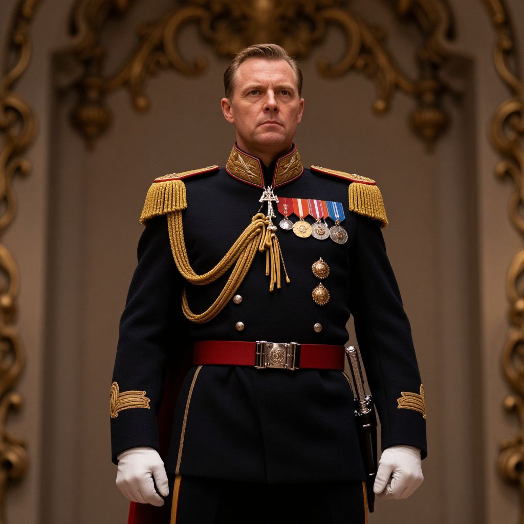 A man dressed in an elaborate military uniform stands solemnly amidst a richly decorated interior. His attire features detailed gold embroidery, epaulettes, and multiple medals, reflecting a formal and authoritative presence reminiscent of a high-ranking officer or ceremonial guard.