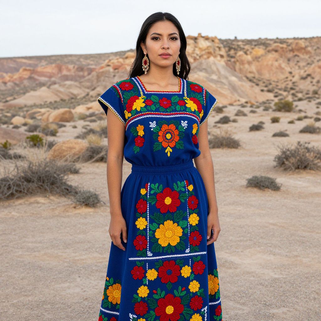 A woman stands confidently in a desert landscape wearing a traditional blue dress adorned with vibrant, colorful floral embroidery. The dress features intricate patterns in red, yellow, and green, showcasing a rich folk art style, complemented by matching ornate earrings.