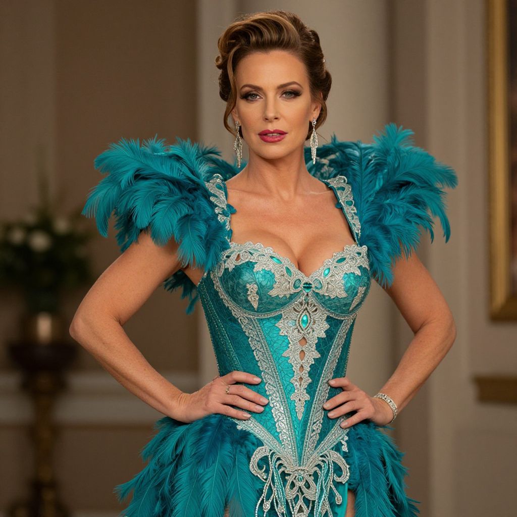 A confident woman poses gracefully wearing an elaborate teal corset dress adorned with intricate silver embroidery and luxurious feathered shoulder details. The sophisticated styling, complemented by her elegant makeup and statement earrings, evokes a glamorous vintage or burlesque-inspired fashion aesthetic.