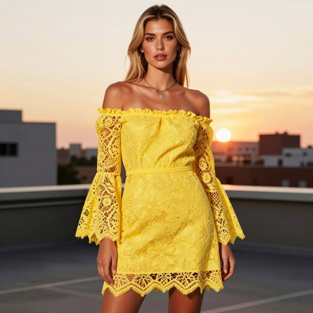 A stylish young woman models an off-shoulder yellow lace dress with intricate floral patterns and flared sleeves, standing against a city rooftop backdrop at sunset. The golden hour lighting enhances the vibrant color of the dress and highlights the delicate texture, creating a warm and elegant atmosphere reflective of contemporary Gen Z fashion.