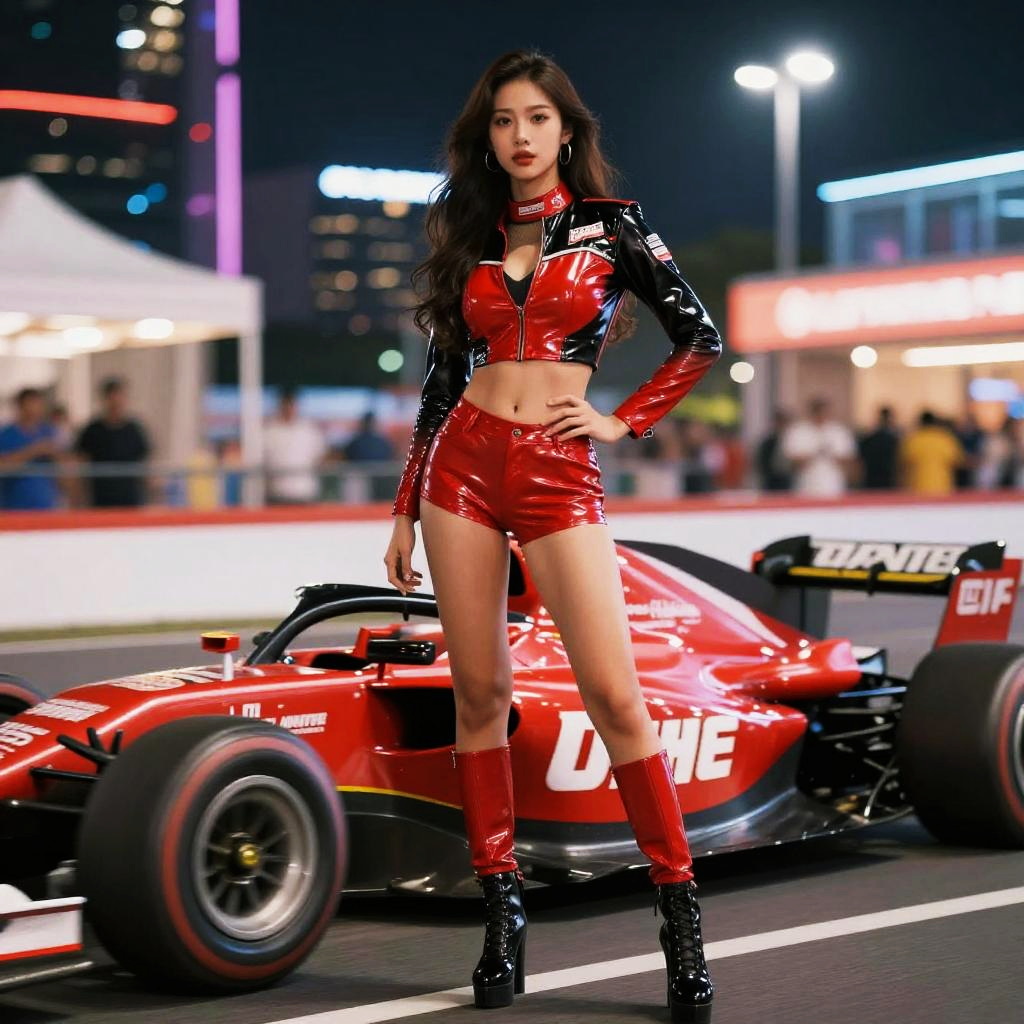 A confident young woman stands next to a sleek red Formula 1 race car at night, dressed in a shiny red and black racing-inspired outfit with matching boots. The urban background with blurred lights adds a modern, high-energy atmosphere to the scene, capturing the essence of motorsport and youthful style.