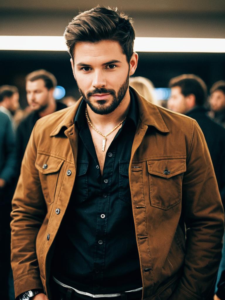 A confident young man with facial hair poses in a stylish casual party outfit featuring a tan jacket over a black shirt. The image captures a modern and fashionable look with soft background lighting and blurred party attendees enhancing the focus on the subject.
