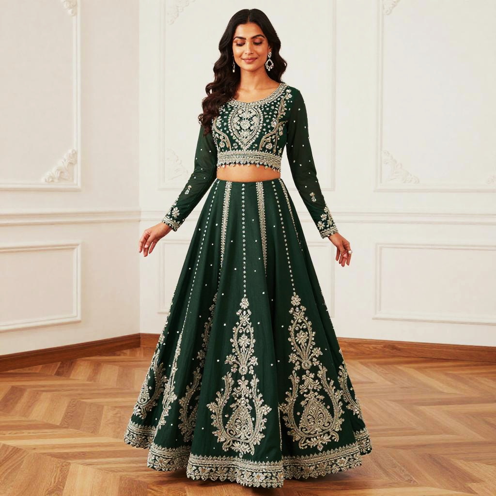 Elegant Dark Green Embroidered Indian Lehenga Outfit for Women