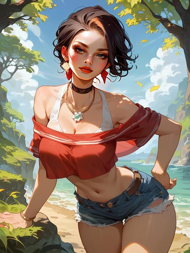 Digital Art of Woman at Seaside in Red Top and Denim Shorts