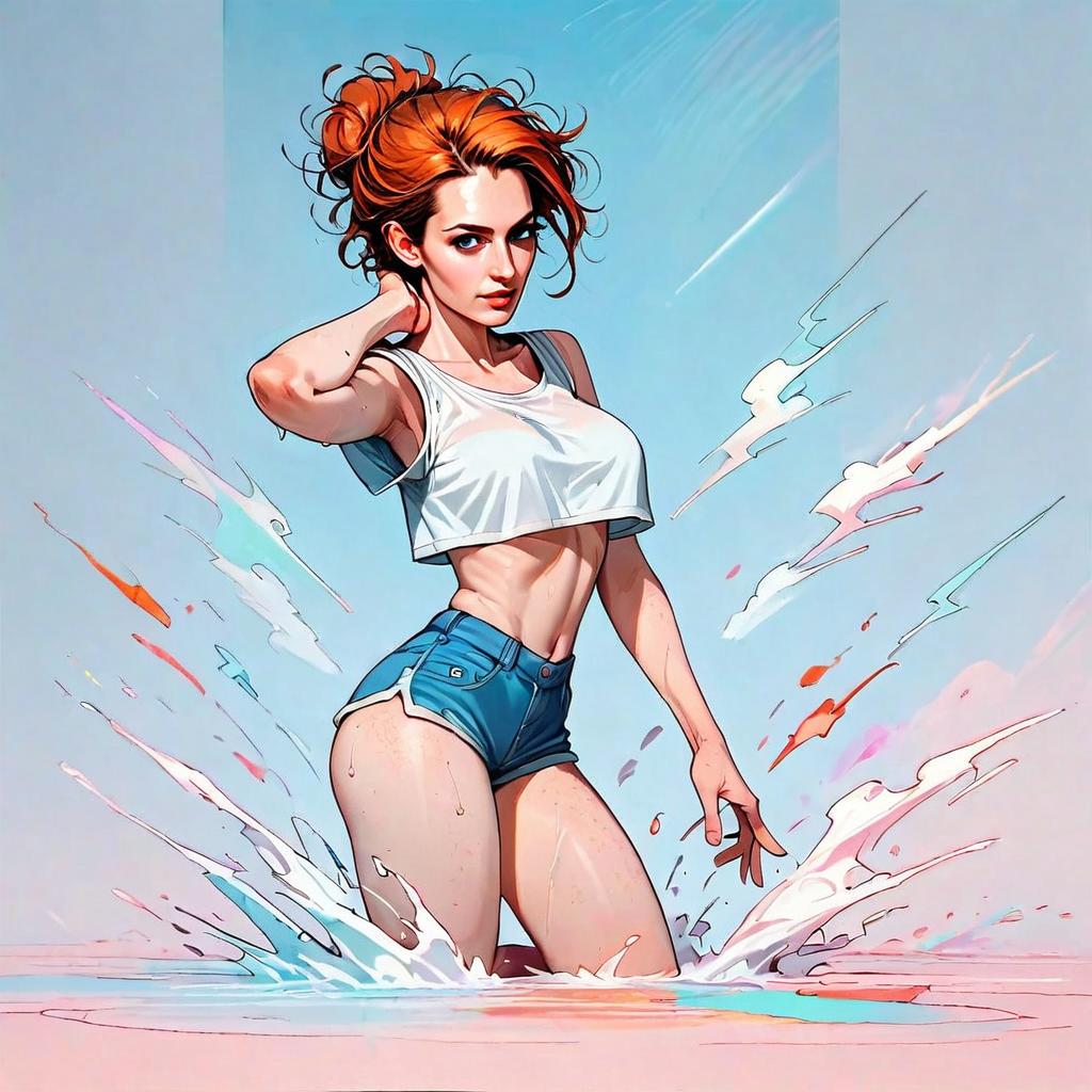 A digital artwork featuring a red-haired woman with a confident pose, standing knee-deep in stylized water splashes. She wears a white cropped t-shirt and blue shorts, with a modern comic book art style characterized by bright colors and dynamic water effects.