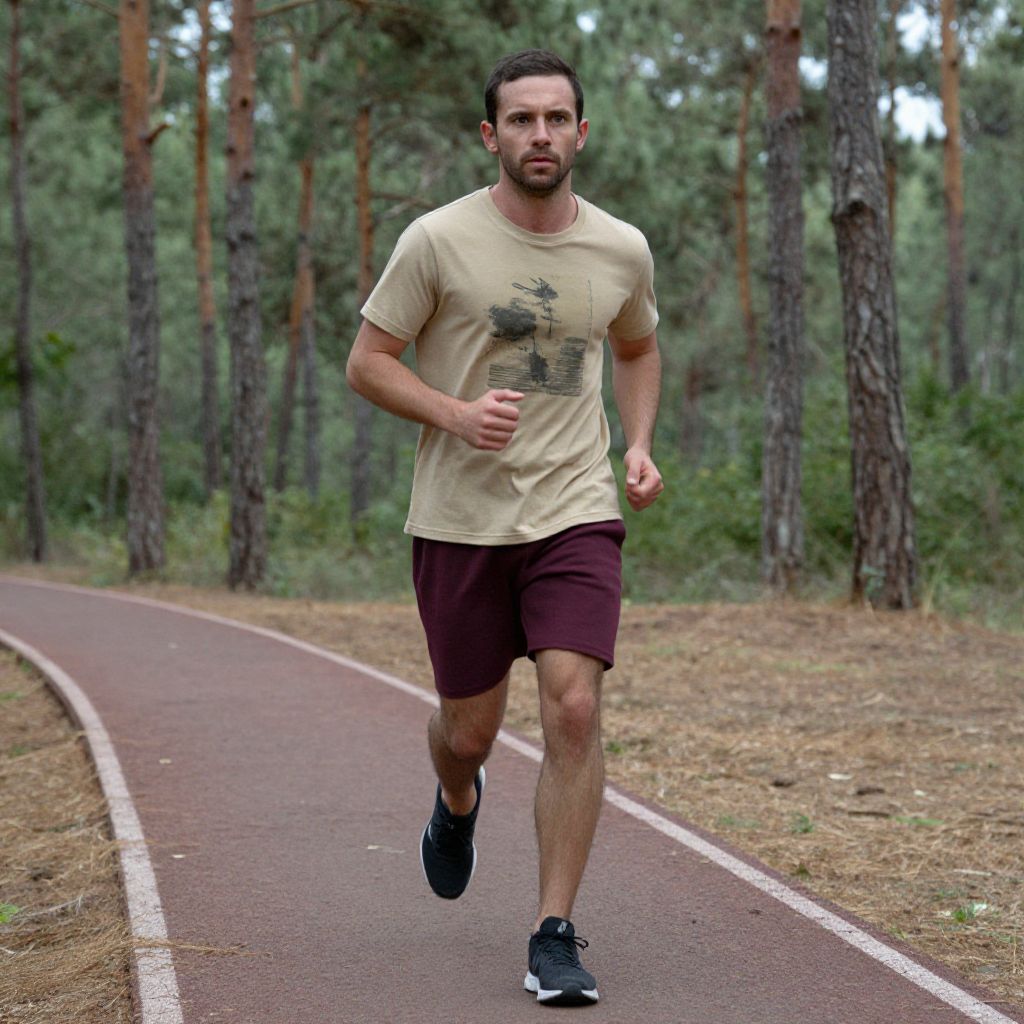 A man is jogging on a paved path through a forested area, surrounded by tall pine trees. He is dressed in casual athletic wear, including a beige graphic t-shirt, maroon shorts, and black running shoes, showing focus and determination during his outdoor exercise.