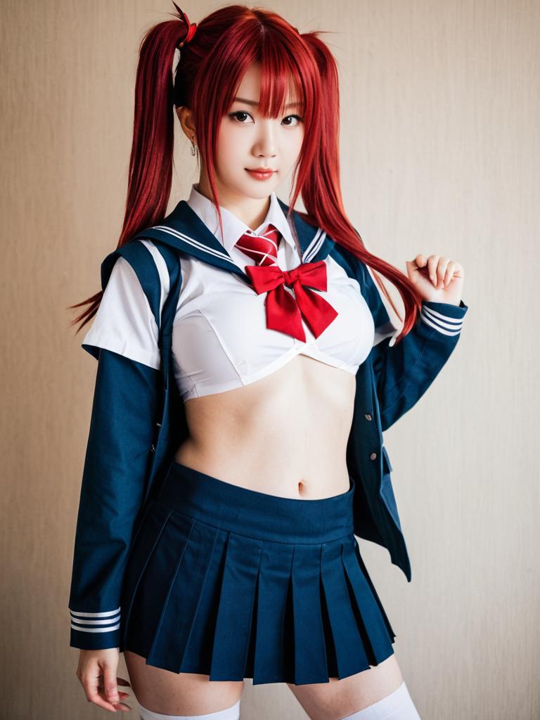 Musujime Awaki Inspired Japanese Schoolgirl Cosplay with Red Hair