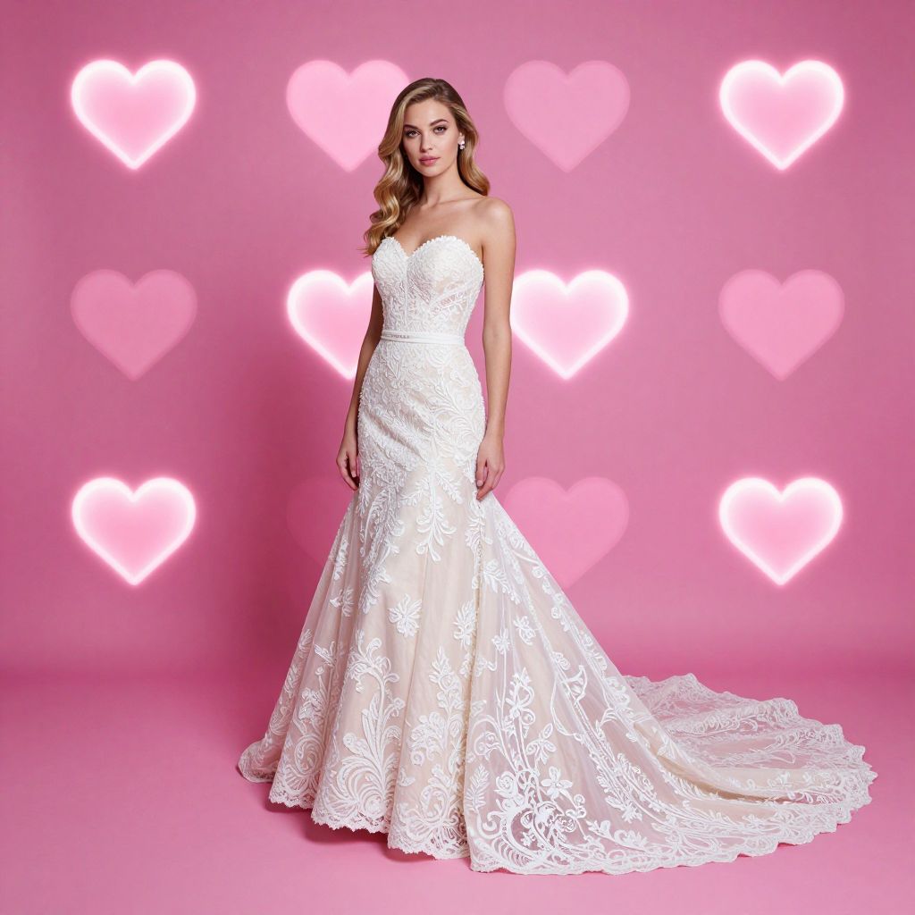 A woman models an elegant strapless wedding gown with intricate lace detailing against a vibrant pink background adorned with glowing heart shapes. The dress features a fitted bodice and a flowing train, creating a romantic and sophisticated bridal look.
