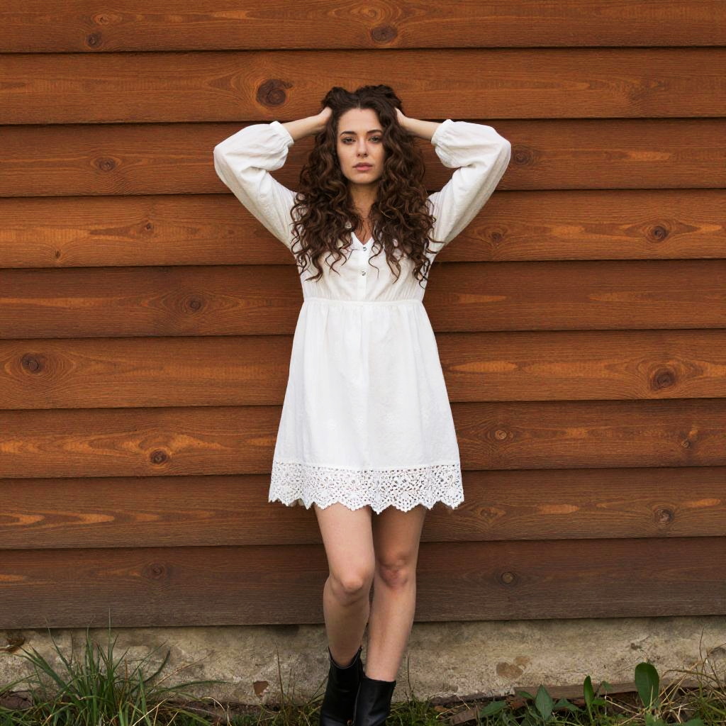 A young woman poses confidently against a wooden wall, wearing a stylish white dress with intricate lace detailing at the hem. Her long, curly hair frames her face as she raises her hands to her head, creating a relaxed and natural look. The rustic background contrasts beautifully with her modern, bohemian-inspired outfit.
