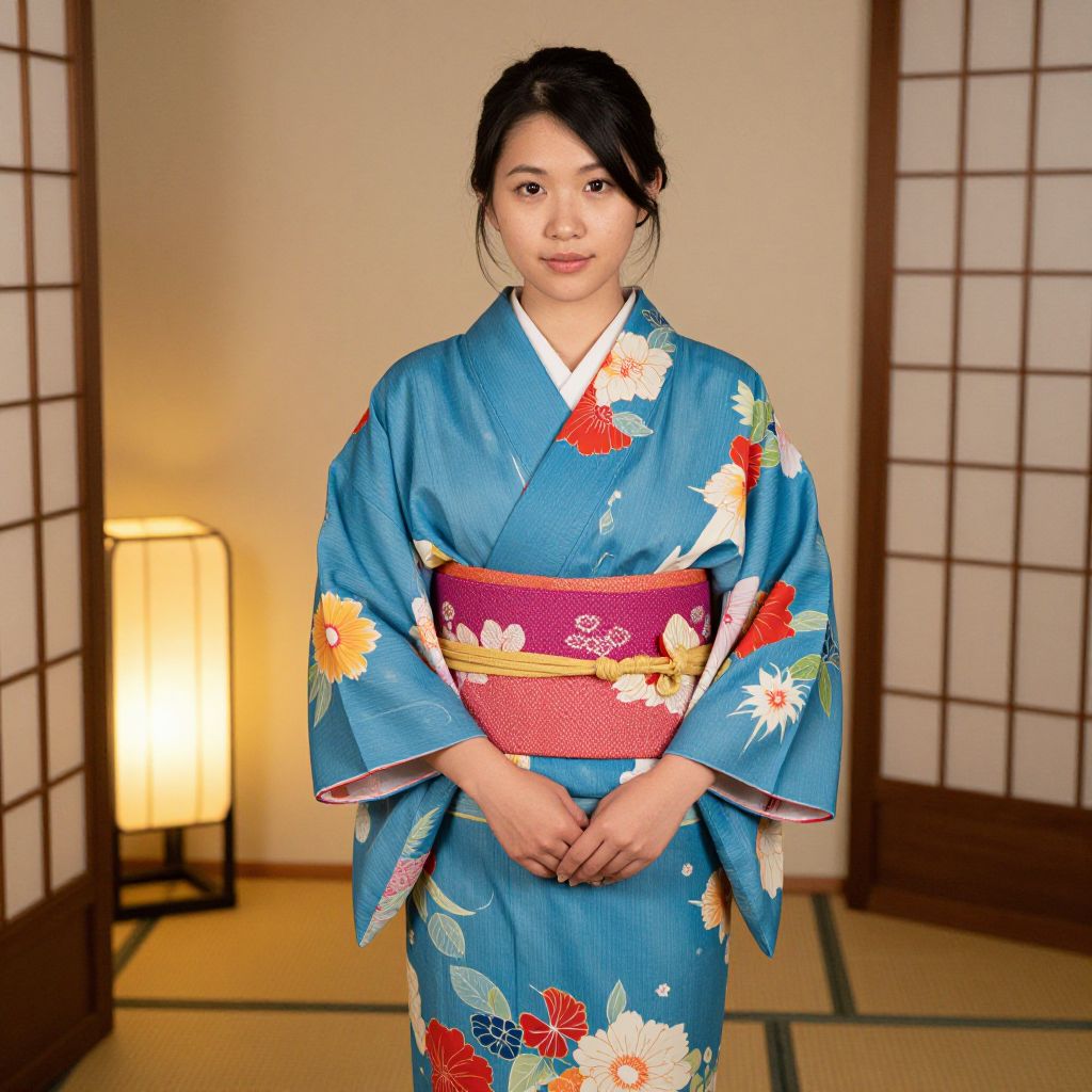 A young woman gracefully dressed in a traditional blue floral kimono stands poised in a classic Japanese-style room. The soft lighting and shoji screens enhance the serene and elegant atmosphere, highlighting the intricate patterns and vibrant colors of her attire.