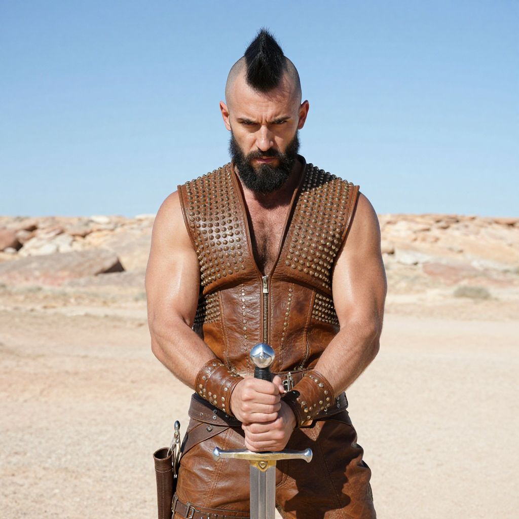 A muscular man with a Mohawk hairstyle and a full beard stands in a desert landscape, gripping a medieval sword with both hands. He wears a studded brown leather vest and matching wristbands, evoking a rugged warrior or post-apocalyptic style.