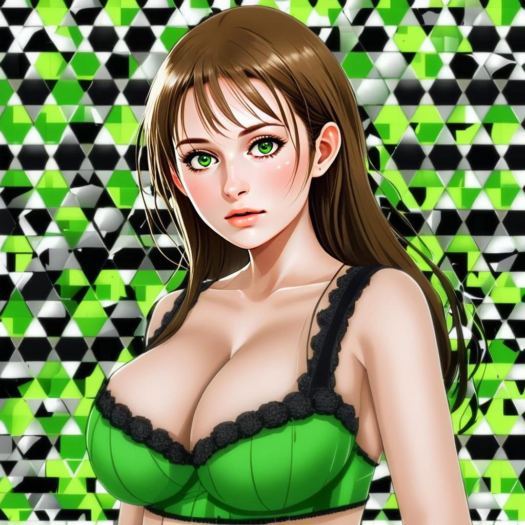 This vibrant anime-style illustration features a young woman with striking green eyes and long brown hair, wearing a detailed green and black lace bra. The background consists of a geometric pattern in shades of green, black, and white, enhancing the modern and dynamic feel of the artwork.