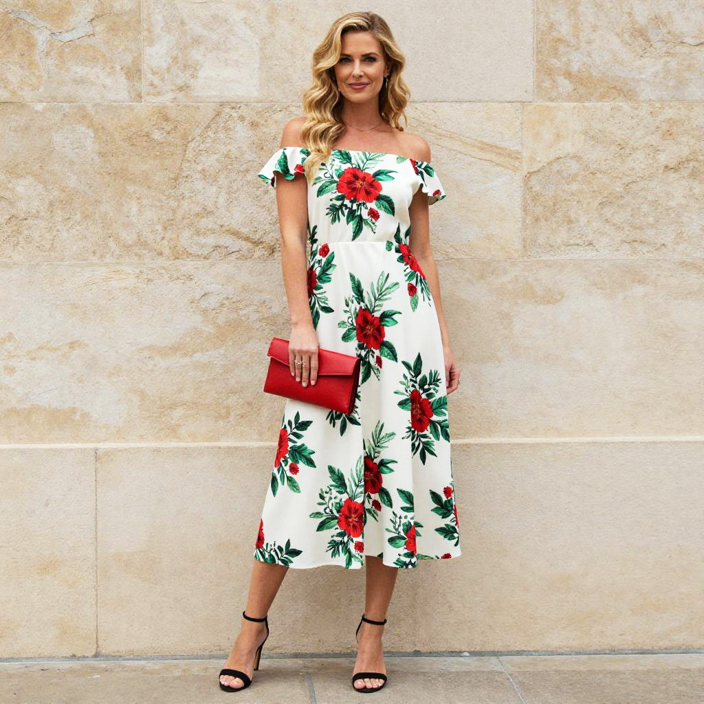 A woman poses confidently in an off-shoulder white dress adorned with bold red and green floral prints. She holds a matching red clutch and wears black high-heeled sandals, standing against a textured stone wall backdrop.