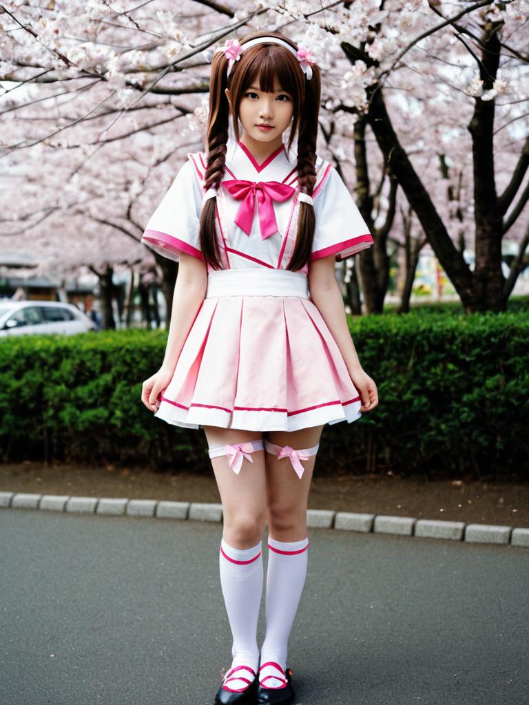 A young woman dressed in a pink and white Japanese schoolgirl-inspired cosplay stands gracefully under blooming cherry blossom trees. Her outfit features a pleated skirt, thigh ribbons, and pigtails adorned with pink flowers, capturing a charming and vibrant springtime aesthetic.