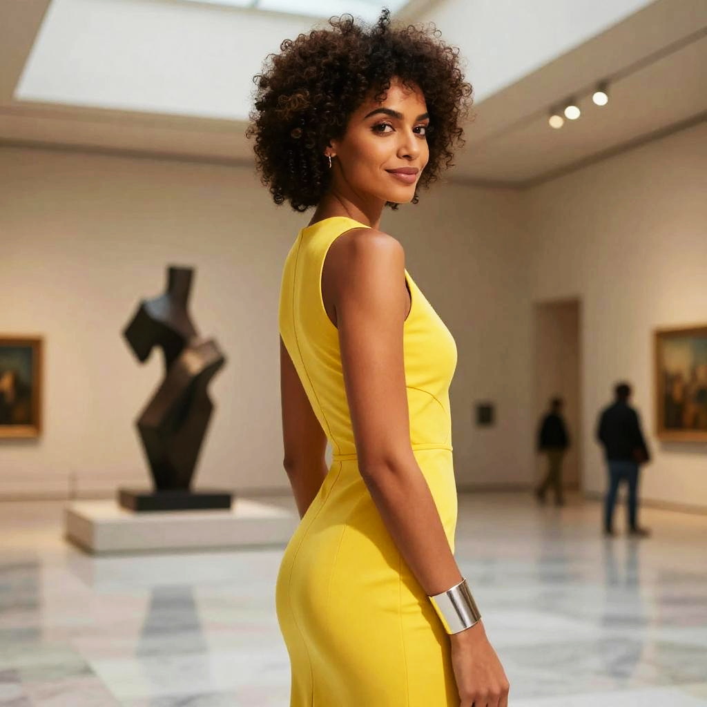 A stylish woman with curly hair wearing a vibrant yellow dress poses confidently inside an art gallery. The modern setting features sculptures and framed paintings, highlighting a blend of contemporary fashion and classic art.