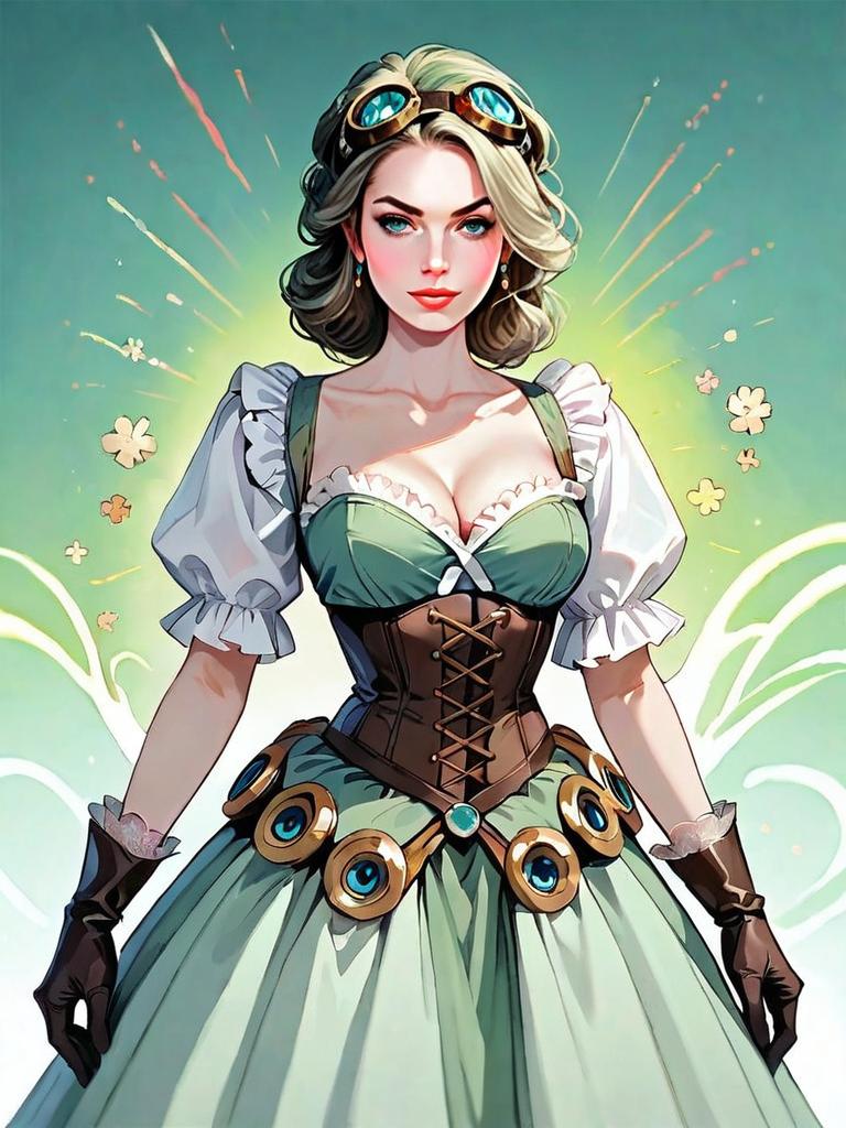 A striking digital illustration of a confident woman dressed in a structured steampunk-inspired outfit featuring a corset and puffed sleeves. The artwork highlights intricate details such as goggles resting on her head, leather gloves, and a belt adorned with circular metallic elements. The realistic style combined with vibrant colors and dynamic lighting emphasizes the character's strong, adventurous aura.