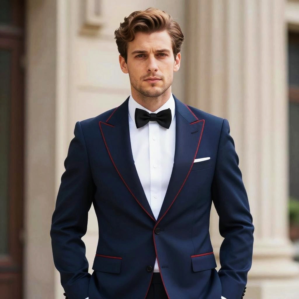 A man dressed in a sharply tailored blue aristocrat-style suit with distinctive red trim accents the lapels and pockets. He wears a classic white shirt paired with a black bow tie, exuding an elegant and sophisticated look suitable for formal occasions.