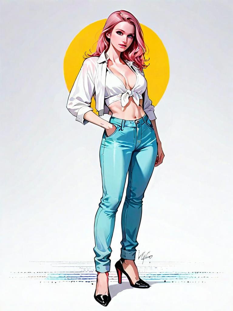 This illustration depicts a confident woman with pink hair styled in a modern, realistic comic art style. She wears a tied-up white shirt, high-waisted light blue jeans, and black high heels, standing against a simple background accented by a yellow circle, emphasizing her full-body pose and stylish look.