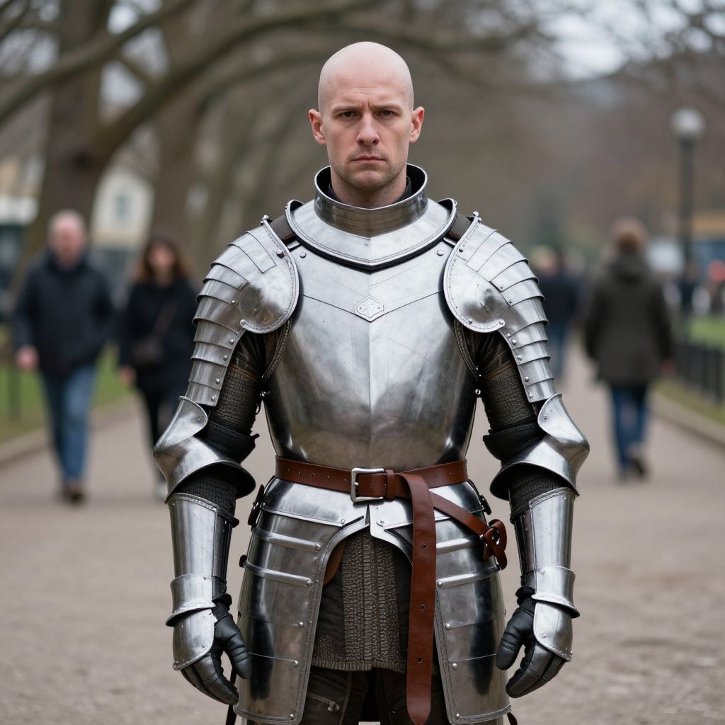 A serious man wearing a full suit of shiny medieval knight armor stands outdoors on a pathway with blurred pedestrians in the background. The photo captures the detailed craftsmanship of the plate armor and the determined expression of the armored man.