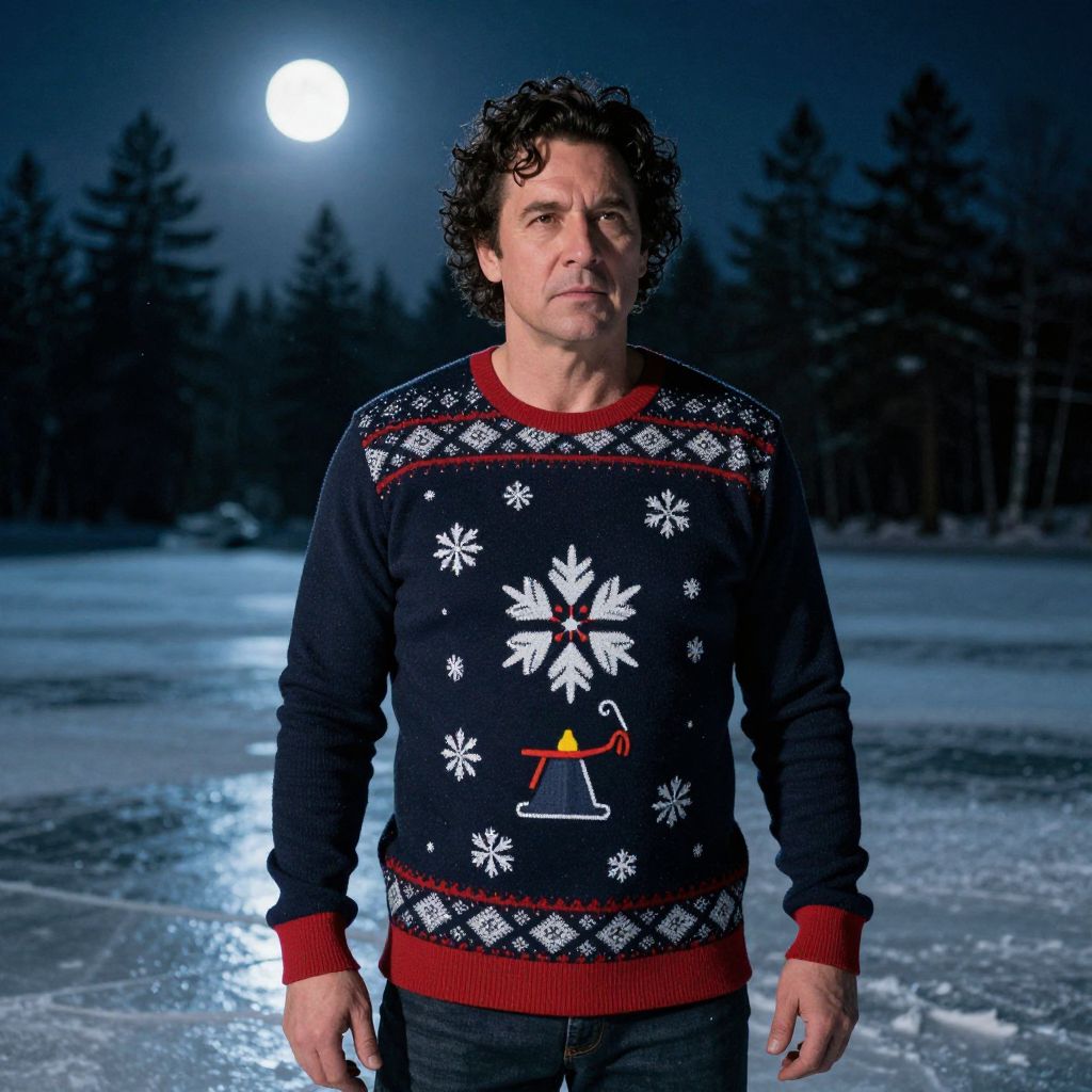 Man Wearing Festive Snowflake Christmas Sweater Outdoors on Frozen Lake at Night