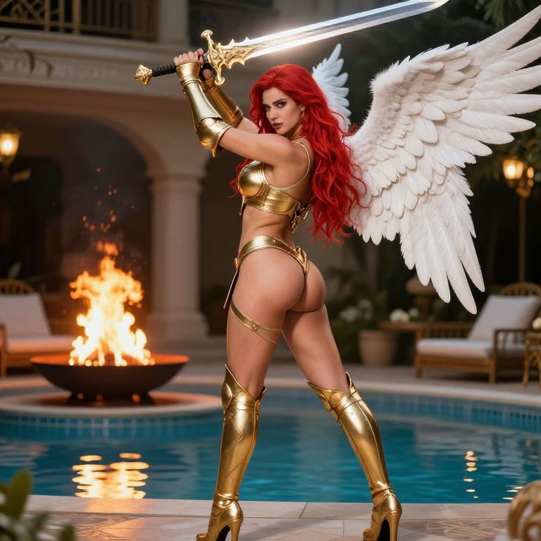 A striking woman with vibrant red hair poses confidently in a gold warrior-style costume with tall boots and arm guards, wielding a large ornate sword. She has majestic white angel wings and stands poised by a pool with a blazing fire pit in the background, creating a dramatic fantasy atmosphere.