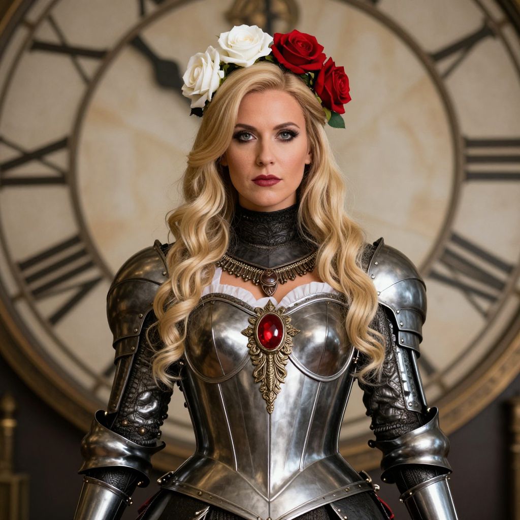 Blonde Woman in Medieval Armor with Rose Crown and Clock Background